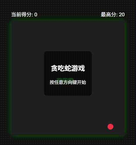 <body><div class="game-container"><div class="score-board"><div>当前得分: <span id="current-score">0</span></div><div>最高分: <span id="high-score">0</span></div></div><canvas id="gameCanvas" ></canvas><div class="start-message" id="startMessage"><h2>贪吃蛇游戏</h2><p>按任意方向键开始</p></div><div class="game-over-overlay" id="gameOverOverlay" ><h2>游戏结束</h2><p>最终得分: <span id="final-score">0</span></p><button class="btn" id="restartBtn">重新开始</button></div></div><script>// 游戏变量const canvas = document.getElementById('gameCanvas');const ctx = canvas.getContext('2d');const currentScoreEl = document.getElementById('current-score');const highScoreEl = document.getElementById('high-score');const finalScoreEl = document.getElementById('final-score');const startMessage = document.getElementById('startMessage');const gameOverOverlay = document.getElementById('gameOverOverlay');const restartBtn = document.getElementById('restartBtn');// 游戏配置const gridSize = 20;const tileCount = canvas.width / gridSize;// 蛇的初始状态let snake = [{ x: 10, y: 10 },{ x: 9, y: 10 },{ x: 8, y: 10 }];// 蛇的方向let direction = 'right';let nextDirection = 'right';// 食物位置let food = generateFood();// 游戏状态let score = 0;let highScore = localStorage.getItem('snakeHighScore') || 0;let gameSpeed = 10;let gameLoopId;let gameStarted = false;// 初始化游戏function init() {// 重置游戏状态snake = [{ x: 10, y: 10 },{ x: 9, y: 10 },{ x: 8, y: 10 }];direction = 'right';nextDirection = 'right';food = generateFood();score = 0;gameSpeed = 10;gameStarted = false;// 更新UIcurrentScoreEl.textContent = score;highScoreEl.textContent = highScore;startMessage.style.display = 'block';gameOverOverlay.style.display = 'none';// 清除之前的游戏循环if (gameLoopId) {clearInterval(gameLoopId);}// 绘制初始状态draw();}// 游戏主循环function gameLoop() {update();draw();}// 更新游戏状态function update() {// 更新方向direction = nextDirection;// 移动蛇头const head = { ...snake[0] };switch (direction) {case 'up':head.y--;break;case 'down':head.y++;break;case 'left':head.x--;break;case 'right':head.x++;break;}// 将新头添加到蛇身snake.unshift(head);// 检测是否吃到食物if (head.x === food.x && head.y === food.y) {// 增加分数score += 10;currentScoreEl.textContent = score;// 检查是否更新最高分if (score > highScore) {highScore = score;highScoreEl.textContent = highScore;localStorage.setItem('snakeHighScore', highScore);}// 生成新食物food = generateFood();// 每吃5个食物提升速度if (score % 50 === 0) {gameSpeed++;clearInterval(gameLoopId);gameLoopId = setInterval(gameLoop, 1000 / gameSpeed);}} else {// 移除蛇尾snake.pop();}// 检测碰撞if (checkCollision()) {gameOver();}}// 绘制游戏function draw() {// 清空画布ctx.clearRect(0, 0, canvas.width, canvas.height);// 绘制蛇snake.forEach((segment, index) => {// 蛇头颜色亮绿色,蛇身颜色稍浅if (index === 0) {ctx.fillStyle = '#4CAF50';} else {ctx.fillStyle = '#45a049';}// 绘制圆角矩形ctx.beginPath();ctx.roundRect(segment.x * gridSize, segment.y * gridSize, gridSize, gridSize, 5);ctx.fill();});// 绘制食物(红色圆形)ctx.fillStyle = '#ff4444';ctx.beginPath();ctx.arc(food.x * gridSize + gridSize / 2, food.y * gridSize + gridSize / 2, gridSize / 2, 0, Math.PI * 2);ctx.fill();}// 处理输入function handleInput(e) {if (!gameStarted) {gameStarted = true;startMessage.style.display = 'none';gameLoopId = setInterval(gameLoop, 1000 / gameSpeed);}const key = e.key;switch (key) {case 'ArrowUp':case 'w':case 'W':if (direction !== 'down') {nextDirection = 'up';}break;case 'ArrowDown':case 's':case 'S':if (direction !== 'up') {nextDirection = 'down';}break;case 'ArrowLeft':case 'a':case 'A':if (direction !== 'right') {nextDirection = 'left';}break;case 'ArrowRight':case 'd':case 'D':if (direction !== 'left') {nextDirection = 'right';}break;}}// 生成食物function generateFood() {let foodX, foodY;let collision;do {collision = false;foodX = Math.floor(Math.random() * tileCount);foodY = Math.floor(Math.random() * tileCount);// 检查食物是否生成在蛇身上for (const segment of snake) {if (segment.x === foodX && segment.y === foodY) {collision = true;break;}}} while (collision);return { x: foodX, y: foodY };}// 检测碰撞function checkCollision() {const head = snake[0];// 检测撞墙if (head.x < 0 || head.x >= tileCount || head.y < 0 || head.y >= tileCount) {return true;}// 检测撞自己for (let i = 1; i < snake.length; i++) {if (head.x === snake[i].x && head.y === snake[i].y) {return true;}}return false;}// 游戏结束function gameOver() {clearInterval(gameLoopId);gameOverOverlay.style.display = 'block';finalScoreEl.textContent = score;}// 事件监听document.addEventListener('keydown', handleInput);restartBtn.addEventListener('click', init);// 初始化游戏init();</script>
